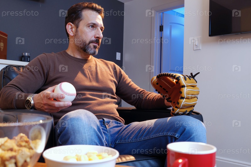 Мужчина средних лет смотрит телевизор, держа в руках бейсбольную перчатку