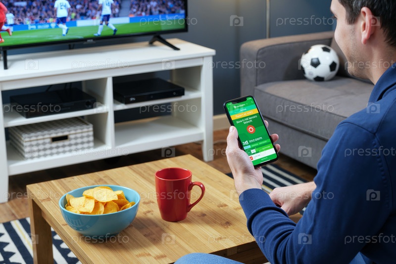 Молодой человек смотрит телевизор, используя смартфон для ставок на спорт