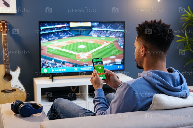 Молодой взрослый чернокожий мужчина смотрит бейсбольный матч по телевизору, используя смартфон