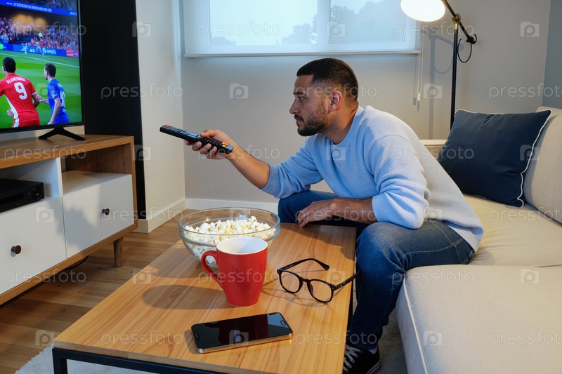 Молодой взрослый мужчина с Ближнего Востока смотрит телевизор и держит пульт управления