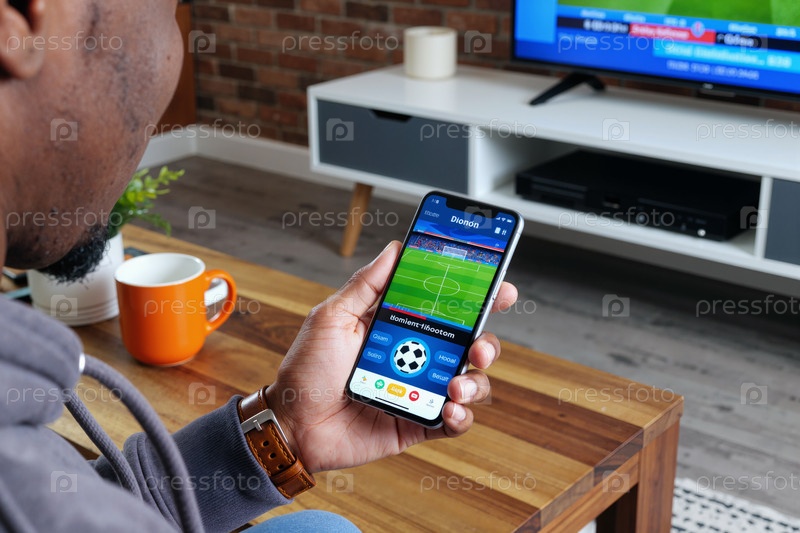 Молодой взрослый чернокожий мужчина смотрит телевизор, используя спортивное приложение для смартфона