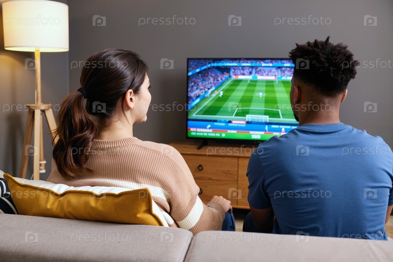 Молодая женщина и молодой чернокожий мужчина смотрят футбольный матч по телевизору