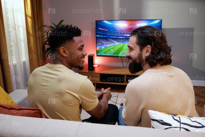 Молодые мультиэтнические мужчины сидят вместе и смотрят футбольный матч по телевизору