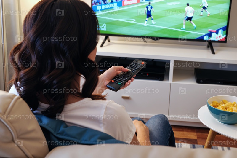 Молодая женщина смотрит на футбольный матч по телевизору, держа дистанционное