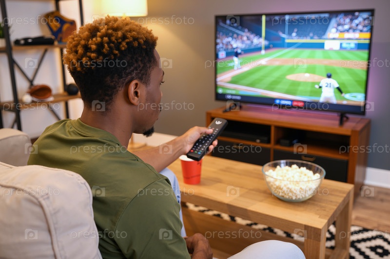 Молодой взрослый чернокожий мужчина смотрит бейсбольный матч по телевизору, сидя в помещении