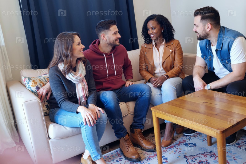Группа молодых взрослых многонациональных друзей, смеющихся вместе в гостиной