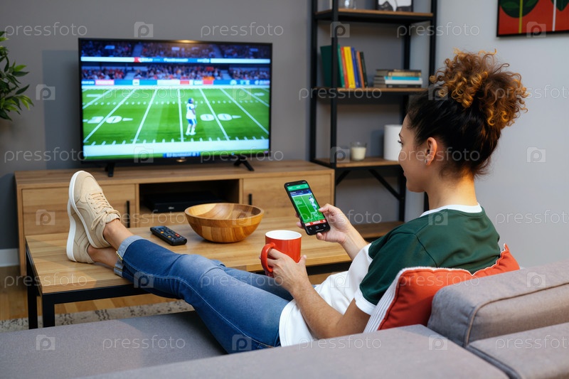Молодая чернокожая женщина смотрит на футбольный матч по телевизору, используя смартфон