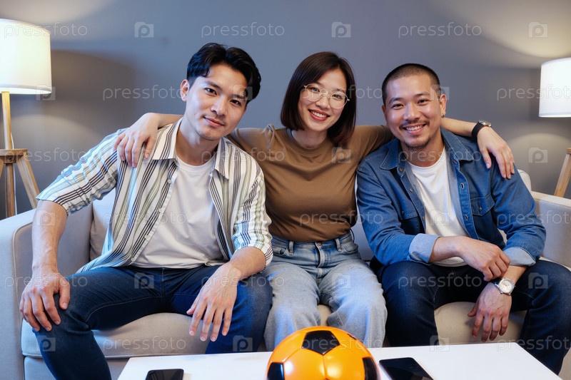 Молодая взрослая азиатская женщина и два мужчины смотрят телевизор и улыбаются вместе