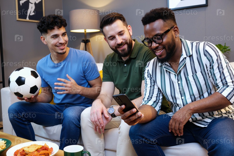 Группа молодых взрослых мультиэтнических мужчин, смотрящих телевизор и смеющихся вместе