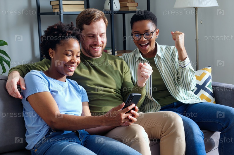 Молодые многонациональные друзья используют мобильное приложение вместе и празднуют победу