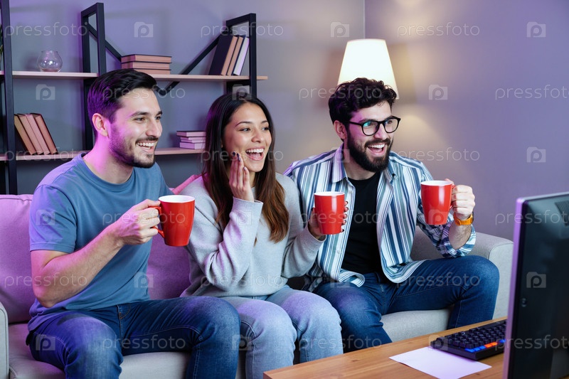 Многонациональные друзья сидят вместе, смотрят телевизор и улыбаются молодыми