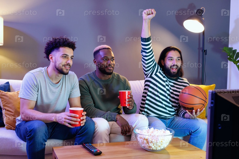 Молодые взрослые мультиэтнические мужчины смотрят телевизор и празднуют спортивную игру