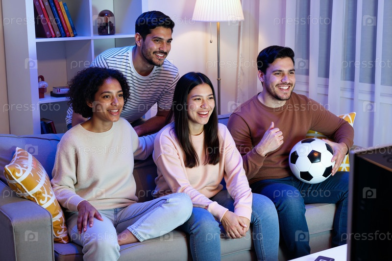 Группа разнообразных молодых взрослых, смотрящих телевизор и наслаждающихся футбольным матчем
