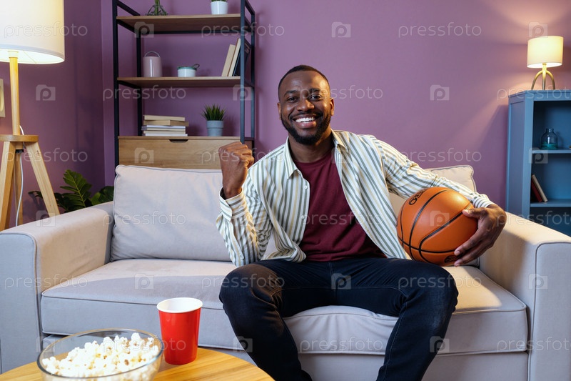 Молодой взрослый чернокожий мужчина смотрит телевизор и празднует баскетбольную игру