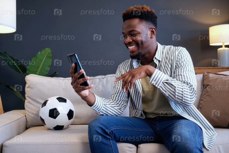 Молодой взрослый чернокожий мужчина улыбается, глядя телевизор на смартфоне