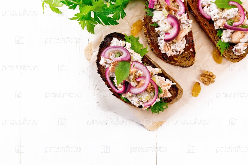 Брускетта с рыбой и творогом на доске наверху