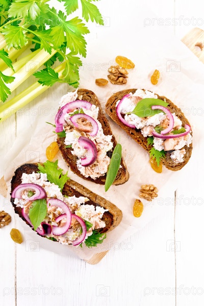 Брускетта с рыбой и творогом на белой доске сверху