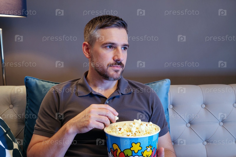 Мужчина средних лет сидит на диване, смотрит телевизор и ест попкорн