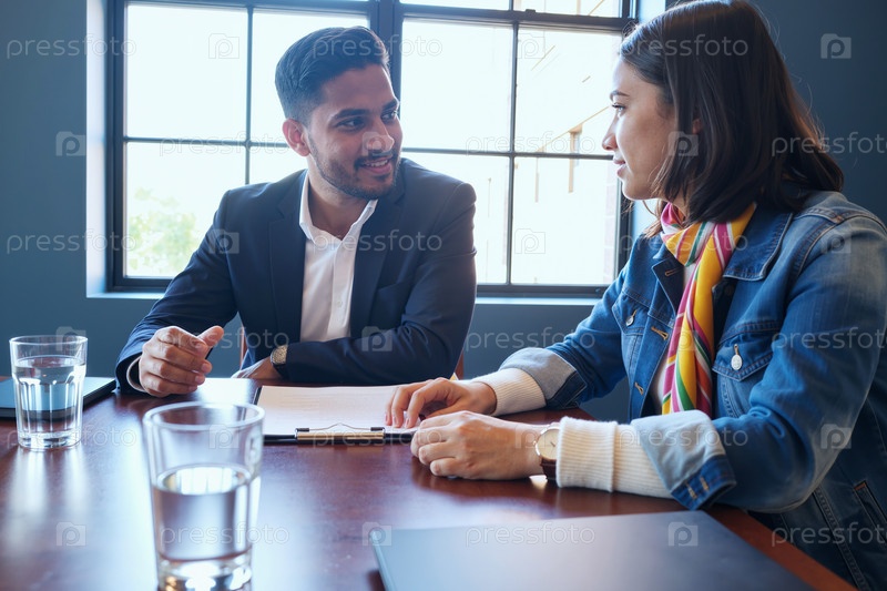 Молодая женщина и молодой южноазиатский мужчина обсуждают деловое соглашение