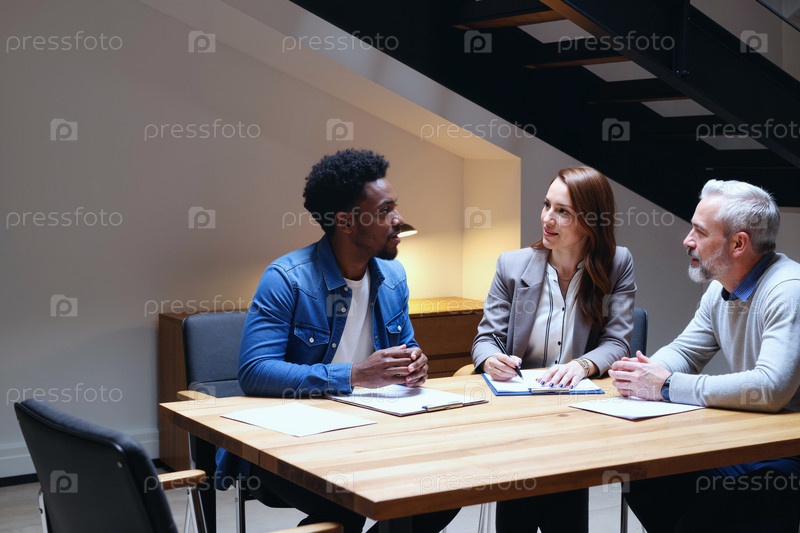 Молодой чернокожий мужчина обсуждает бизнес-стратегию с коллегами в помещении