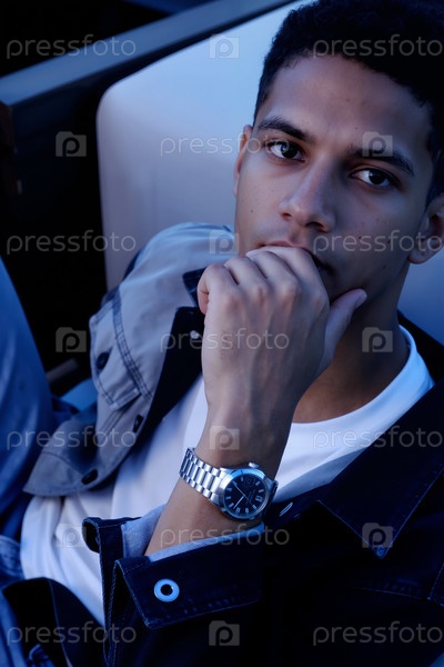 Портрет молодого взрослого мужчины, сидящего вдумчиво и смотрящего на камеру