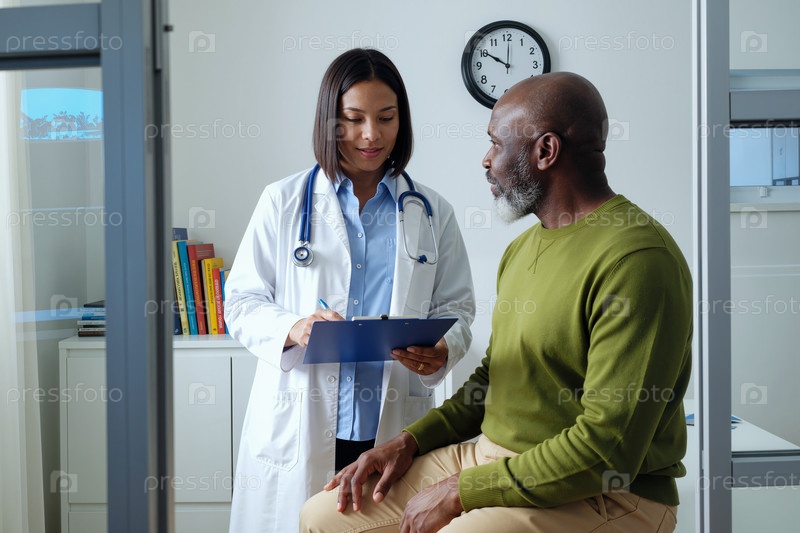 Чернокожий мужчина среднего возраста консультируется с женщиной-врачом во время медицинской встречи