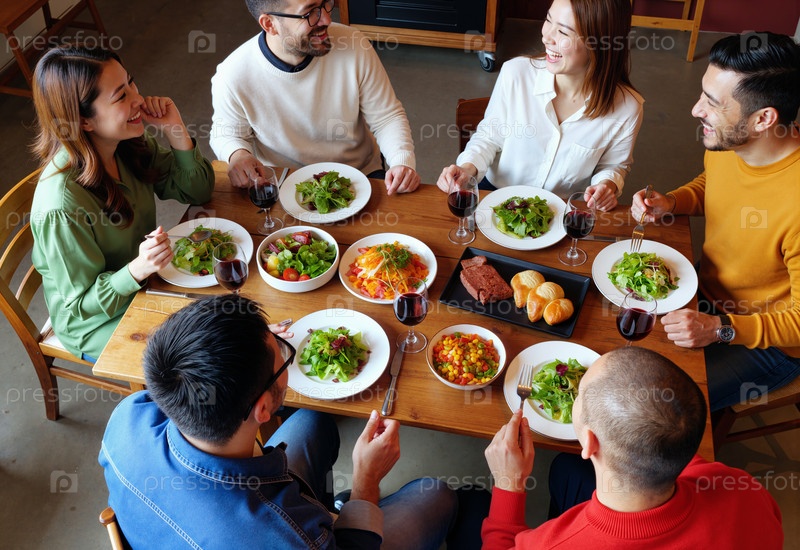 Группа молодых взрослых друзей, наслаждающихся ужином и смеющимся вместе в помещении