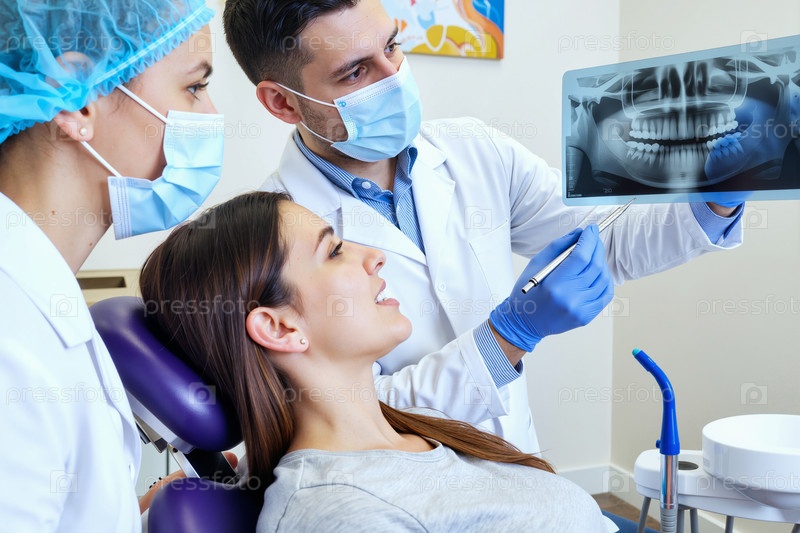 Молодая женщина сидит в стоматологическом кресле, наблюдая рентгеновские лучи с дантистами