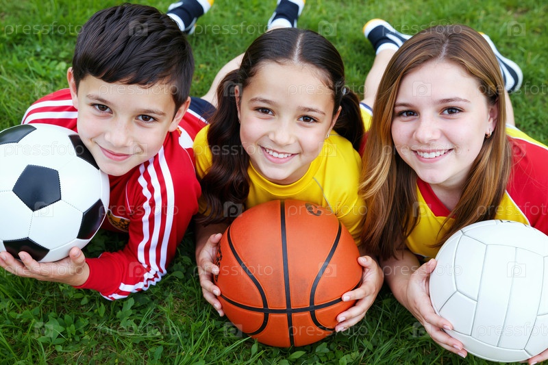 Портрет многонациональных детей, улыбающихся в то время как они держали спортивные мячи на открытом воздухе