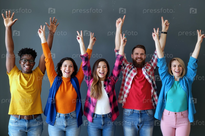 Разнообразная группа молодых взрослых празднует вместе с поднятыми руками и улыбкой