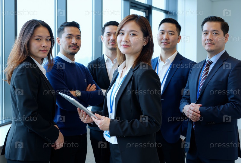 Группа молодых взрослых азиатских бизнес-профессионалов, позирующих в современном офисе