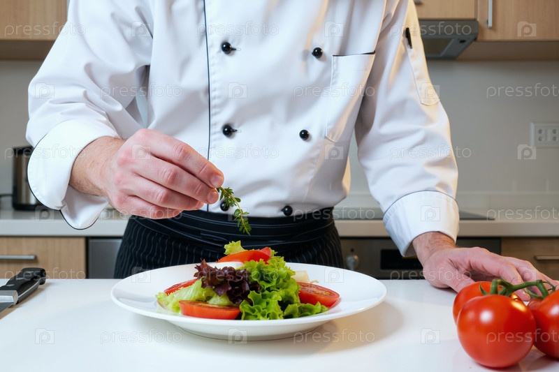 Молодой взрослый мужчина шеф-повар украшает свежий салат на современной кухне