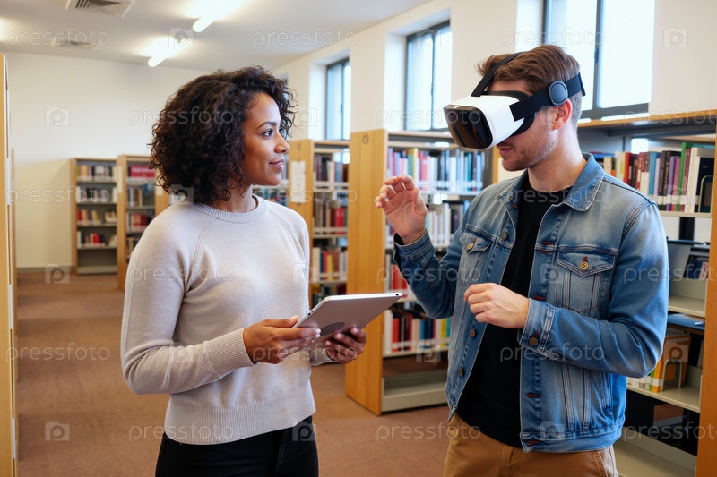 Молодой человек использует гарнитуру виртуальной реальности во время разговора с молодой чернокожей женщиной