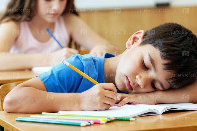 Молодой мальчик спит, пока пишет в классе во время школьного урока