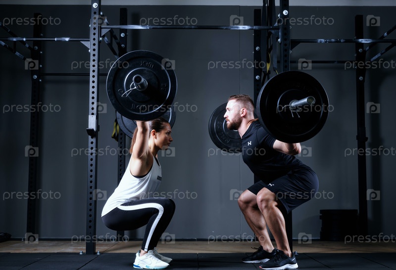 Молодой мужчина и молодая женщина выполняют тяжеловесные приседания