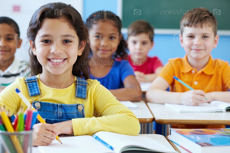 Портрет многонациональных детей, улыбающихся и учащихся вместе в классе