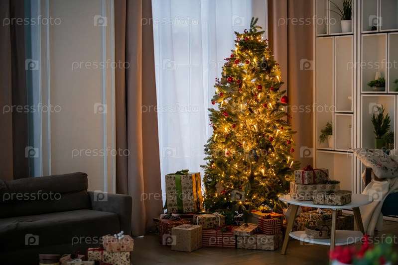 Декорированная рождественская елка и уютный стул в гостиной, готовые к праздничному сезону