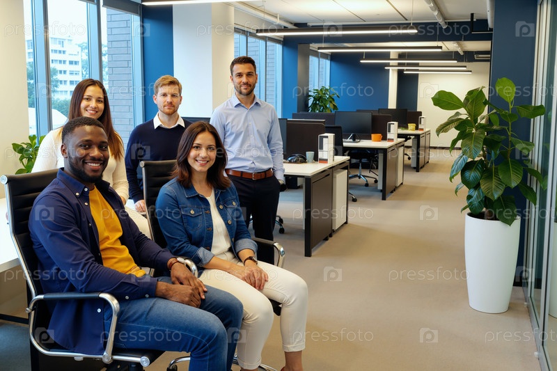 Мультиэтническая команда молодых взрослых позирует и улыбается в современном офисном рабочем пространстве