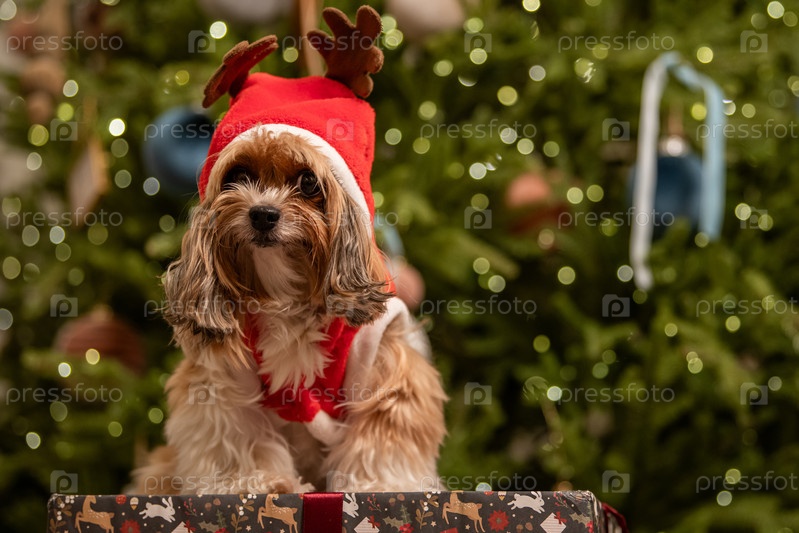 Милая собака в оленевой шляпе и красный свитер сидит за рождественским подарком среди размытого изображения елки с гирляндами для праздничной открытки