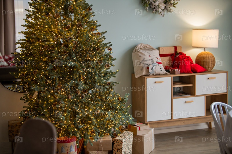 Декорированная рождественская елка и уютный стул в гостиной, готовые к праздничному сезону