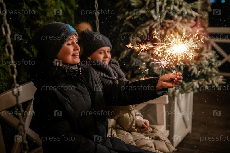 Дети держат бенгальские огни во время зимнего фестиваля на открытом воздухе. Праздничный семейный момент под падающим снегом перед праздниками