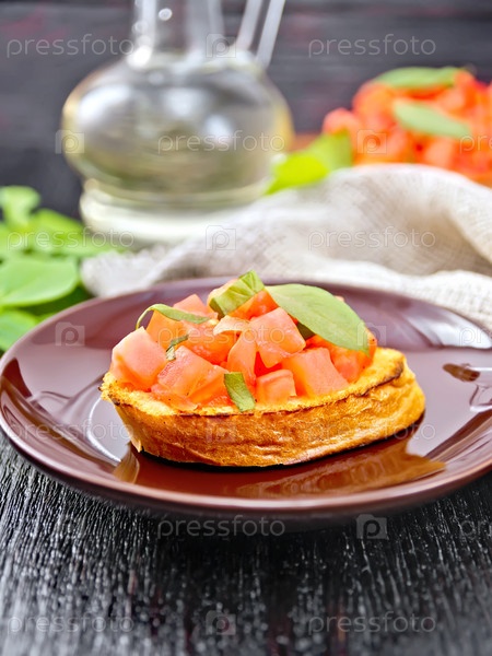 Брускетта с помидором и базиликом в тарелке на темной доске