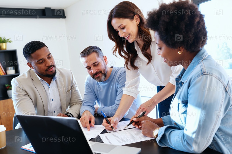 Мультиэтническая команда молодых взрослых и специалистов среднего возраста, рассматривающих документы