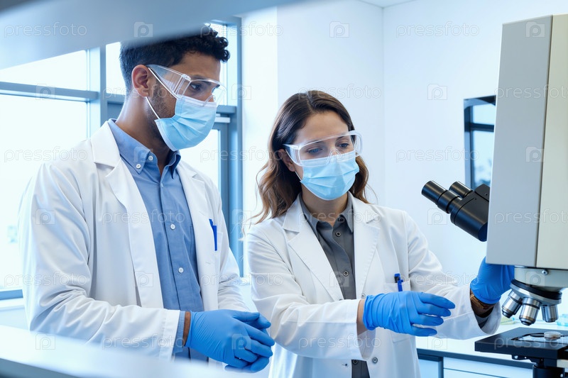 Молодая взрослая женщина и молодой взрослый мужчина используют микроскоп в лаборатории