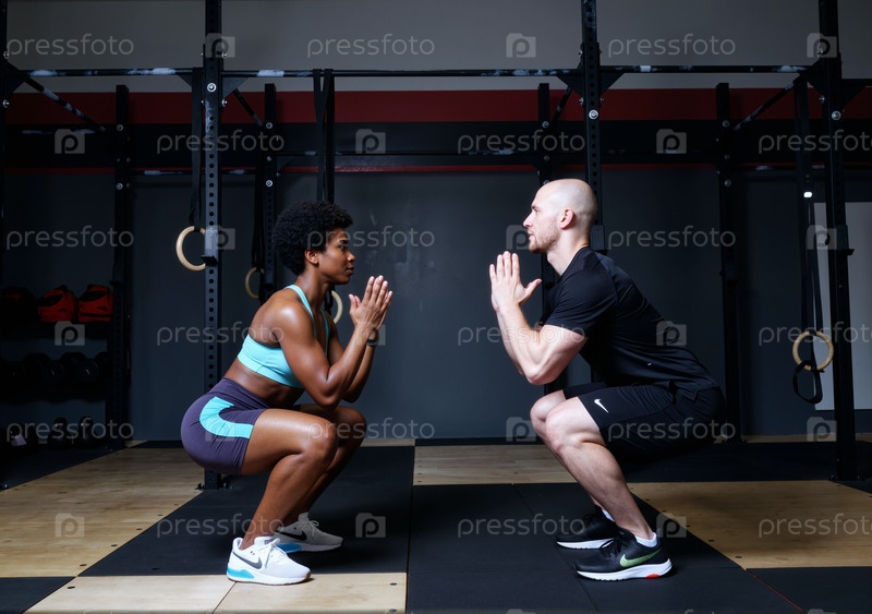 Молодая взрослая чернокожая женщина и мужчина вместе занимаются спортом в помещении
