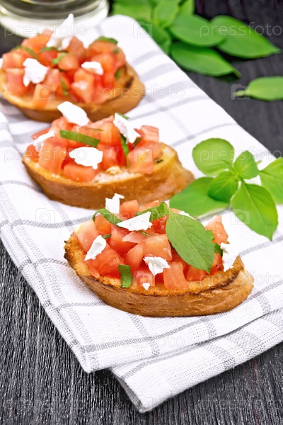 Брускетта с помидором и фетой на темной доске
