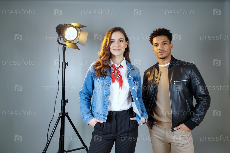Молодая женщина и молодой чернокожий мужчина уверенно позируют в студии