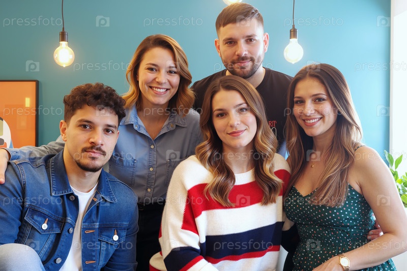 Портрет мультиэтнических молодых взрослых, улыбающихся вместе в современной офисной обстановке