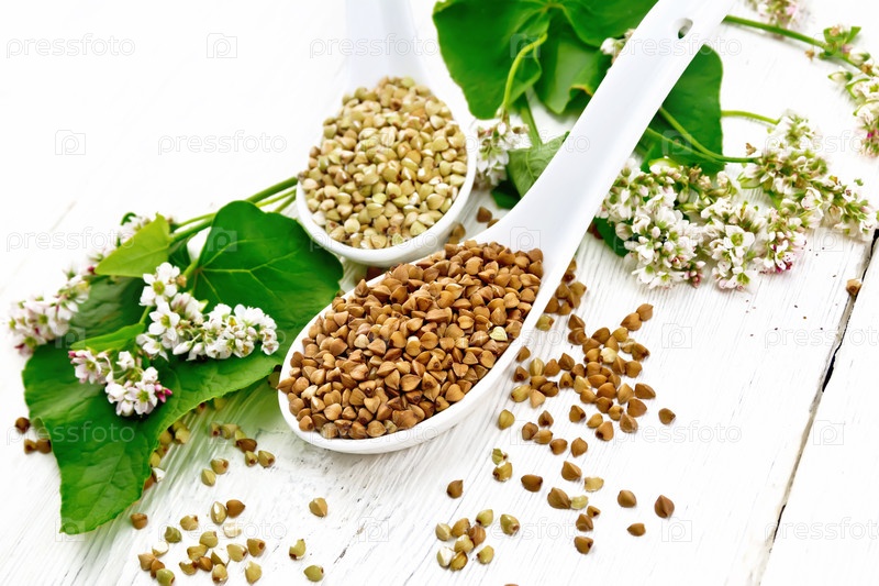 Гречка коричневая и зеленая в ложках на доске