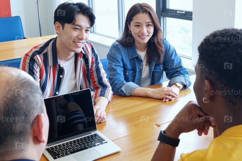 Мультиэтническая команда сотрудничает во время деловой встречи в офисе Young